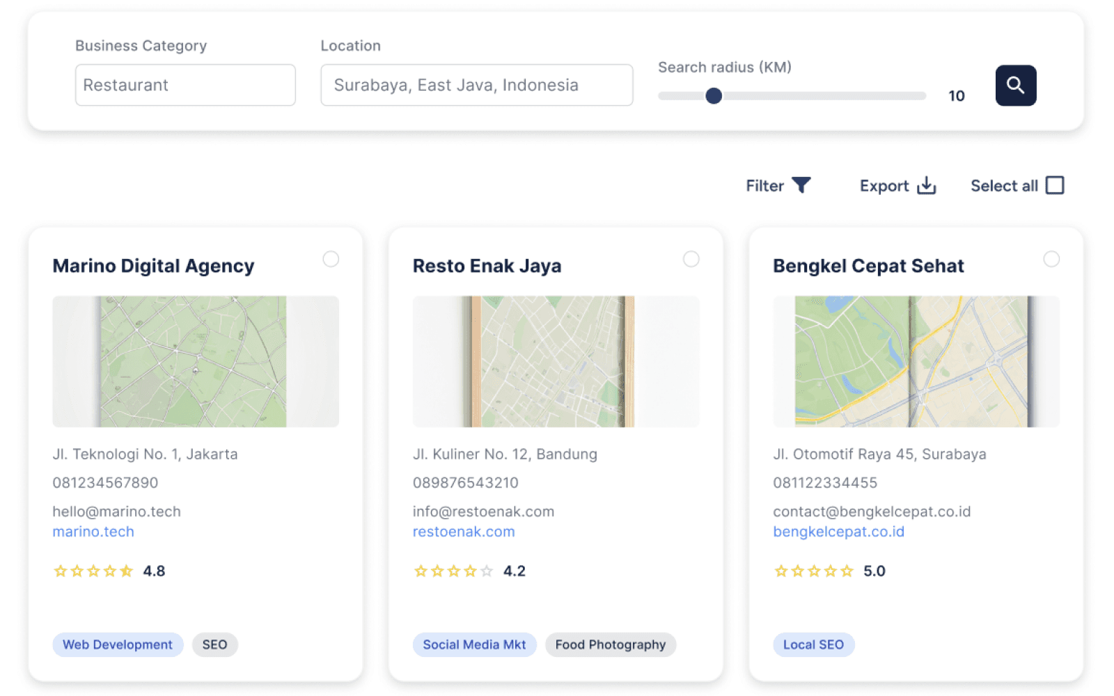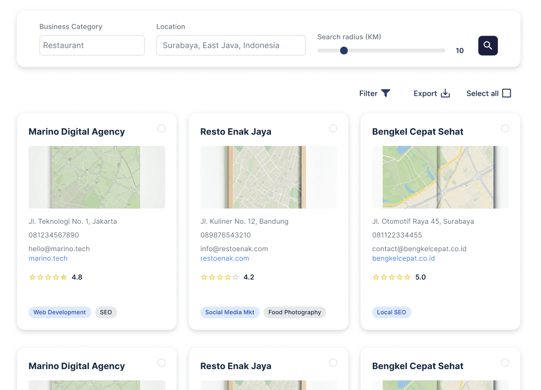 Discover legal worldwide businesses contact from Google Maps, categorized and ready to contact — all within seconds.